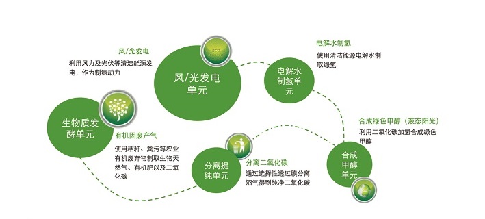 風光生物質(zhì)聯(lián)合制儲氫(液態(tài)陽光)一體化碳中和技術(shù)是國能中電以國家“雙碳”目標為指引,在自身優(yōu)勢的生物質(zhì)能技術(shù)基礎(chǔ)之上,打破產(chǎn)業(yè)壁壘,融通產(chǎn)業(yè)鏈條,成功孵化的以風能、太陽能、生物質(zhì)能、氫能等清潔能源為代表的一體化碳中和項目,該項目主要包括風力發(fā)電單元、電解水制氫單元、生物質(zhì)發(fā)酵產(chǎn)氣單元、合成甲醇單元,在消納秸稈等有機固廢的同時,利用清潔能源為氫能產(chǎn)業(yè)提供綠色甲醇,通過能源循環(huán)利用最終實現(xiàn)碳中和。該項目建立了全新的清潔能源產(chǎn)業(yè)鏈協(xié)同利用模式,是國能中電碳中和路徑的有益實踐,也是我國能源結(jié)構(gòu)重整的創(chuàng)新之舉。