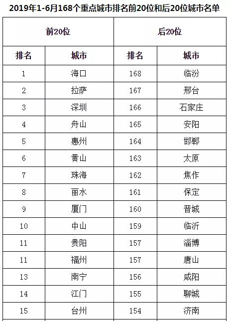 2019年1-6月,168個重點(diǎn)城市中臨汾、邢臺、石家莊市等20個城市空氣質(zhì)量相對較差(從第168名到第149名);???、拉薩、深圳市等20個城市空氣質(zhì)量相對較好(從第1名到第20名,見附表2)。