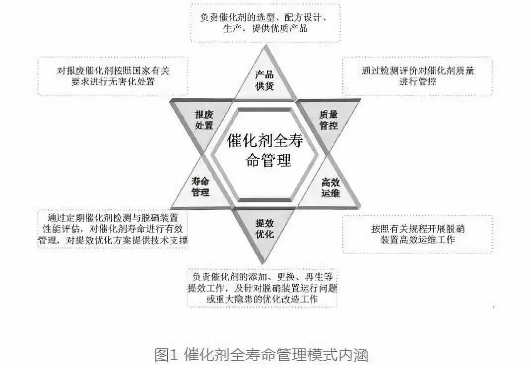早期管理模式—主要應(yīng)對環(huán)保達(dá)標(biāo)排放以及技改工程限期治理要求,在早期大規(guī)模工程改造以及催化劑市場供不應(yīng)求的形勢下,僅僅是單純粗放式的工程階段設(shè)備“買+ 裝”模式,缺乏對催化劑產(chǎn)品質(zhì)量的管控?,F(xiàn)行管理模式—鑒于早期管理模式在工程投運(yùn)后產(chǎn)生的一系列問題,近年來發(fā)電企業(yè)對催化劑質(zhì)量加強(qiáng)了管控,初步形成了“買+ 檢+ 裝+ 不定期檢”的模式,但由于缺乏連續(xù)性與整體性考慮,未能充分調(diào)動各方單位的參與度,責(zé)任單位往往在于發(fā)電企業(yè),相關(guān)工作開展較為被動,難以實(shí)現(xiàn)對催化劑全壽命周期的采購質(zhì)量、運(yùn)行壽命以及脫硝運(yùn)維成本的有效管控。